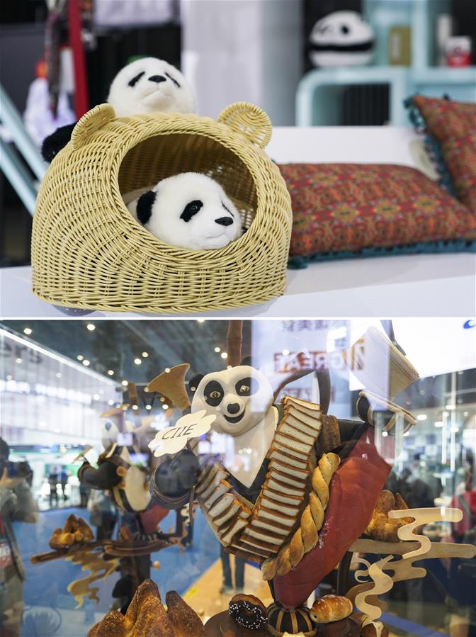 Combo photo shows panda-shaped toys displayed at the booth of southwest China's Sichuan Province on Nov. 9, 2020 (top); and a panda-shaped pastry displayed at the booth of Lesaffre at the Food and Agricultural Products exhibition area on Nov. 8, 2020, during the third China International Import Expo (CIIE) in Shanghai, east China. CIIE not only provides business opportunities for enterprises, but also becomes a platform to display items of various cultural features. (Xinhua/Zhang Haofu)