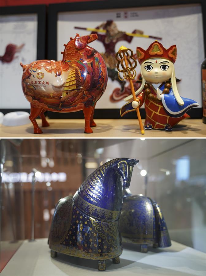 Combo photo taken on Nov. 9, 2020 shows a horse-shaped cultural and creative product displayed at the booth of northwest China's Shaanxi Province (top); and a horse-shaped porcelain artwork from Iran displayed at the Consumer Goods exhibition area, during the third China International Import Expo (CIIE) in Shanghai, east China. CIIE not only provides business opportunities for enterprises, but also becomes a platform to display items of various cultural features. (Xinhua/Zhang Haofu)