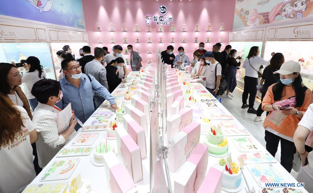 Visitors watch accessory materials for cakes on the Bakery China 2021 exhibition at the Shanghai New International Expo Centre in east China's Shanghai, April 27, 2021. The exhibition opened here on Tuesday where more than 2,300 exhibitors in the bakery industry showcased their products, services and technologies. [Photo by Fang Zhe/Xinhua]