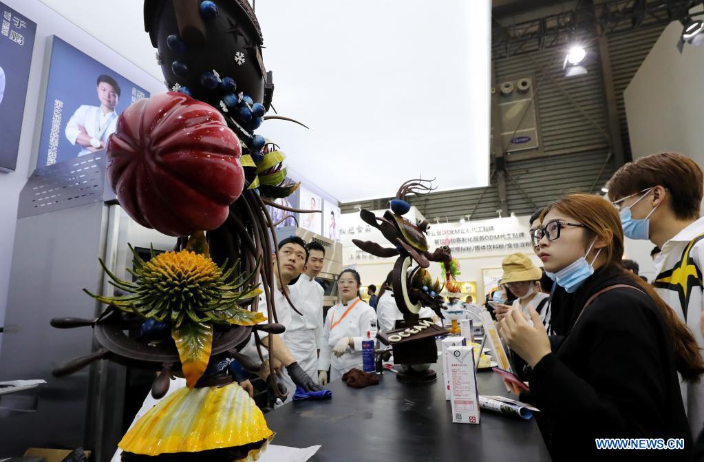 Visitors watch a collection of items made of chocolate on the Bakery China 2021 exhibition at the Shanghai New International Expo Centre in east China's Shanghai, April 27, 2021. The exhibition opened here on Tuesday where more than 2,300 exhibitors in the bakery industry showcased their products, services and technologies. [Photo by Fang Zhe/Xinhua]