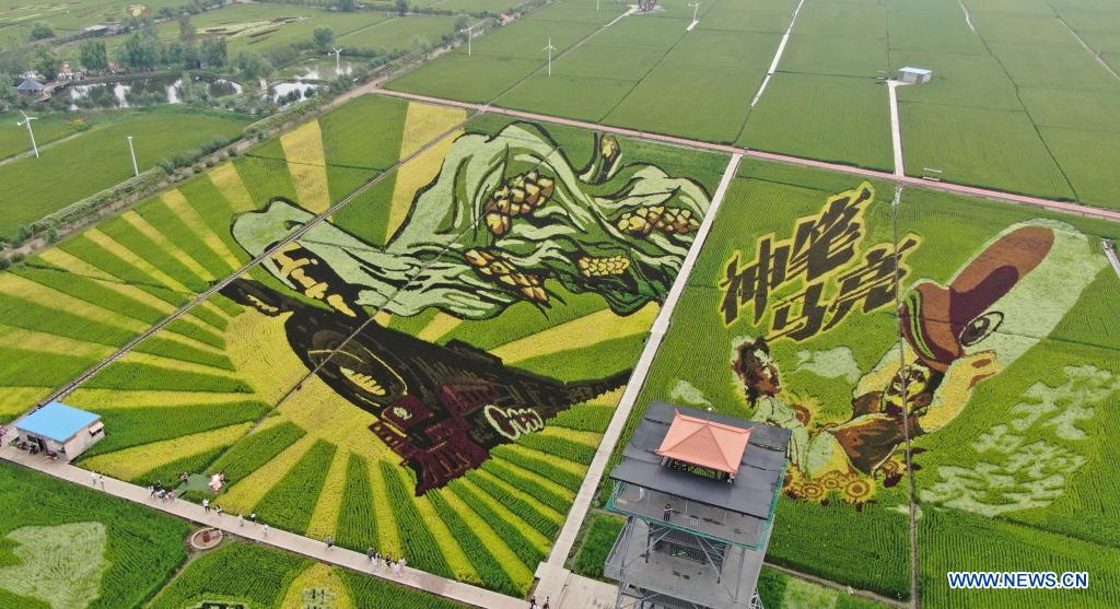 Aerial photo taken on Aug. 16, 2021 shows rice paddy art in Shenyang, northeast China's Liaoning Province. (Xinhua/Yang Qing)