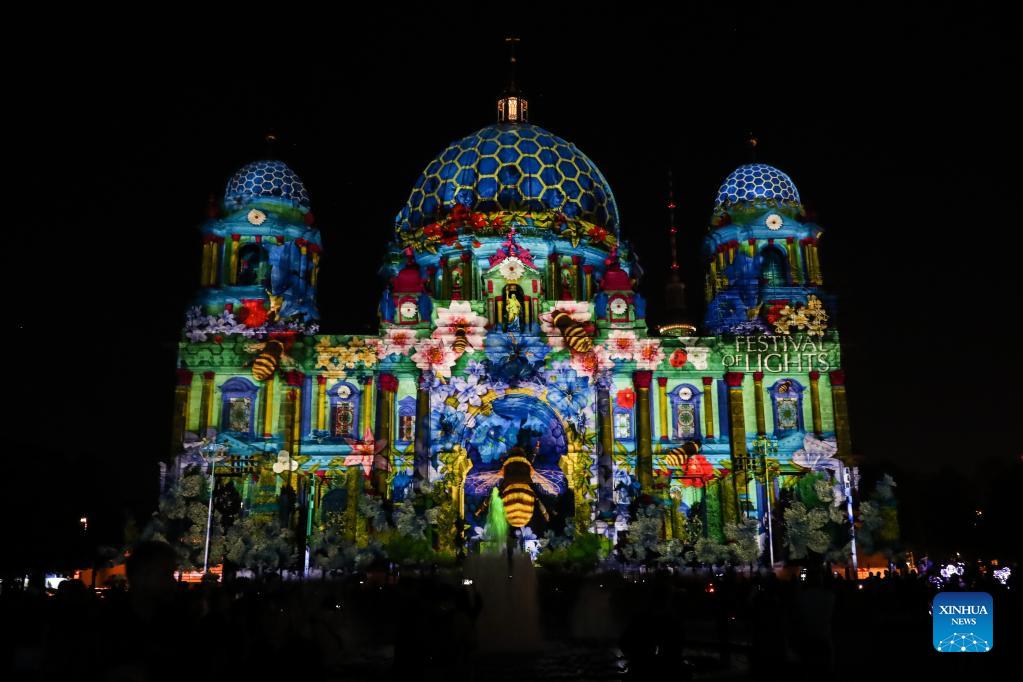 Photo taken on Sept. 3, 2021 shows the Berlin Cathedral illuminated during the 2021 Festival of Lights in Berlin, Germany. Berlin on Friday turned into a city of light art with the opening of the 2021 Festival of Lights, which will last until Sept. 12. (Xinhua/Shan Yuqi)