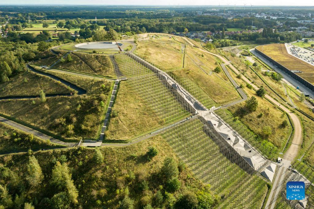 Aerial photo taken on Oct. 4, 2021 shows the Adventure Mountain at the be-MINE recreation and tourism center in Beringen, Belgium. In 2009, Beringen started a project named "be-MINE", aiming to redevelop an abandoned colliery. After years of practice, the former coal mine is now transformed into a recreation and tourism center. (Xinhua/Zhang Cheng)