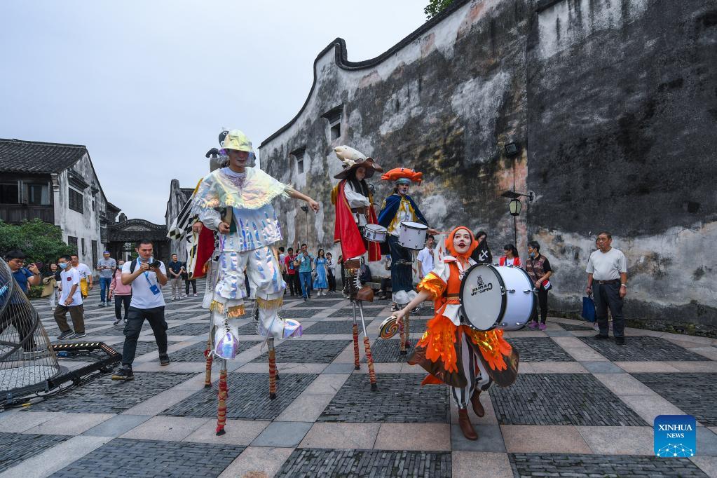 Actors perform during a carnival of the 8th Wuzhen Theater Festival in Wuzhen scenic spot of Tongxiang City, east China's Zhejiang Province, Oct. 15, 2021. The theater festival kicked off here on Friday. [Photo by Xu Yu/Xinhua]