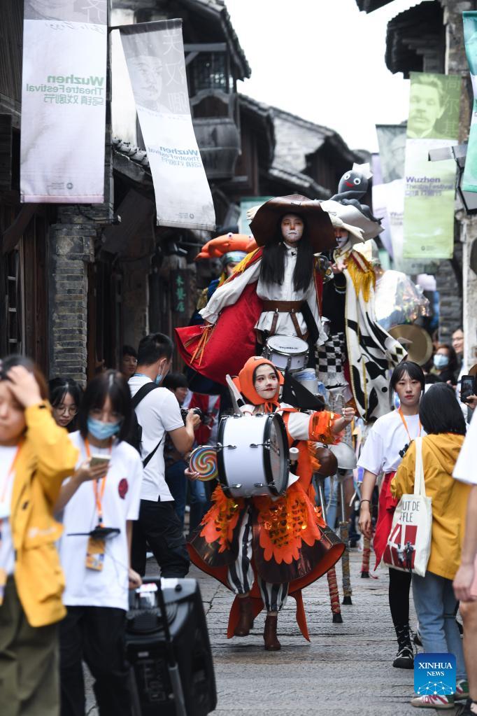Actors perform during a carnival of the 8th Wuzhen Theater Festival in Wuzhen scenic spot of Tongxiang City, east China's Zhejiang Province, Oct. 15, 2021. The theater festival kicked off here on Friday. [Photo by Xu Yu/Xinhua]