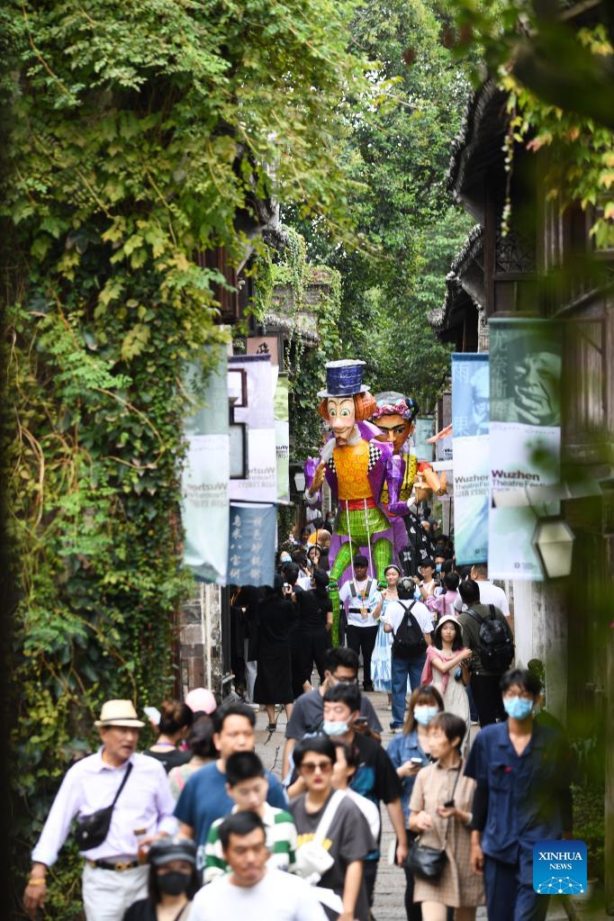 10月15日,戏剧节上的大型木偶参加巡游表演。当日,第八届乌镇戏剧节在浙江省桐乡市乌镇景区开幕。本届戏剧节以“茂”为主题,以特邀剧目、青年竞演、古镇嘉年华、小镇对话四个单元呈现。[新华社记者 徐昱 摄]