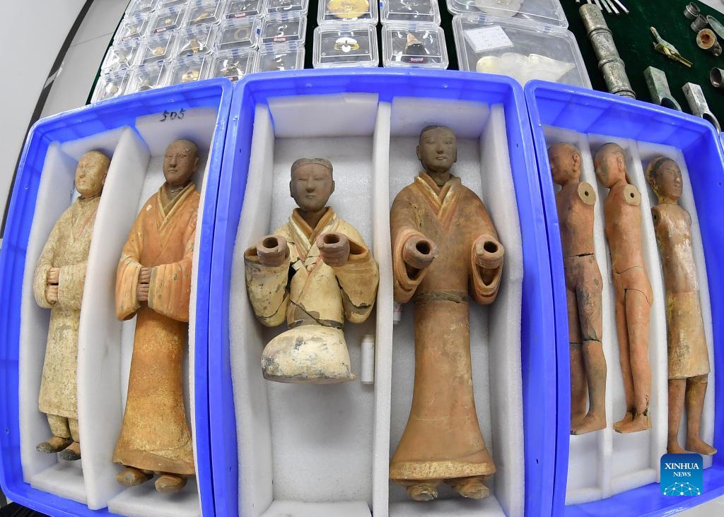 A picture taken with a fish-eye lens on Dec. 16, 2021 shows ancient colored pottery figurines unearthed from the large-scale mausoleum and the mausoleum of Empress Dowager Bo, mother of Emperor Wendi of the Western Han Dynasty (202 BC-AD 25), in northwest China's Shaanxi Province. A large-scale mausoleum in Xi'an has been identified as belonging to Emperor Wendi of the Western Han Dynasty (202 BC-AD 25), local authorities said Tuesday. The mausoleum, located in Jiangcun Village on the eastern outskirts of Xi'an, is surrounded by more than 100 ancient tombs and outer burial pits. Excavation has been carried out in the area since 2017, with numerous relics unearthed including dressed pottery figurines, crossbows, and official seals. [Photo by Zhang Bowen/Xinhua]