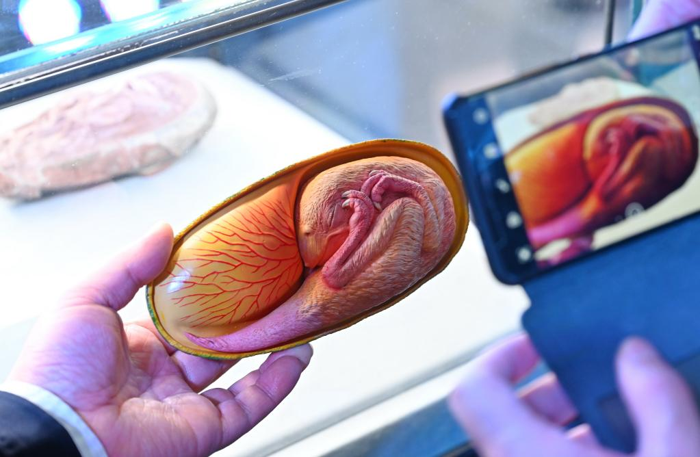 A fossilized dinosaur egg model is pictured at Fujian Science and Technology Museum in Fuzhou, southeast China's Fujian Province, Dec. 22, 2021. A new study examining an embryo from a fossilized dinosaur egg has provided further evidence supporting the notion that modern birds evolved from dinosaurs. [Photo by Lin Shanchuan/Xinhua]