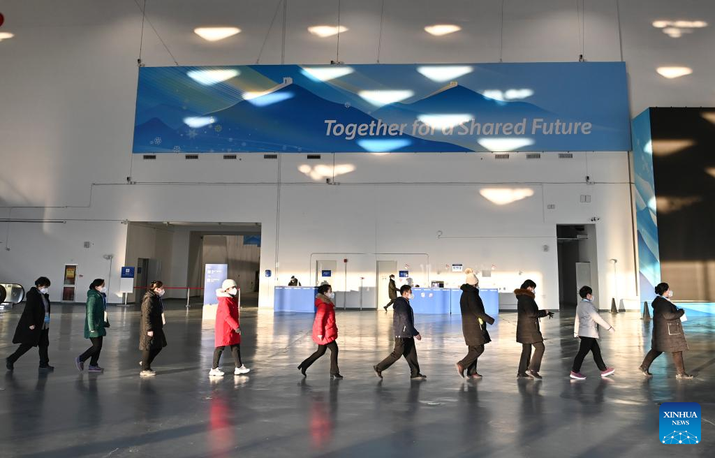Staff walk in a line at the Main Media Center for the 2022 Olympic and Paralympic Winter Games in Beijing, capital of China, Jan. 10, 2022. [Photo by He Changshan/Xinhua]