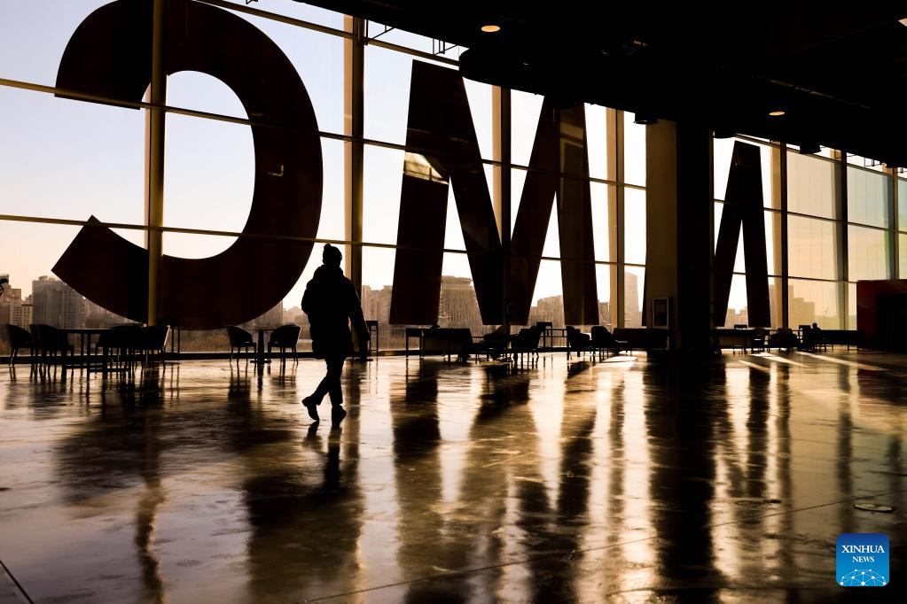 A staff walks past Media Lounge of the Main Media Center for the 2022 Olympic and Paralympic Winter Games in Beijing, capital of China, Jan. 10, 2022. [Photo by Xu Zijian/Xinhua]