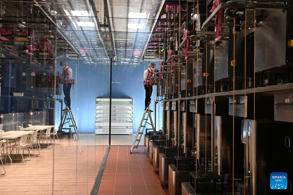 A staff maintains a facility of delivering dishes at the Media Dining Hall of the Main Media Center for the 2022 Olympic and Paralympic Winter Games in Beijing, capital of China, Jan. 10, 2022. [Photo by He Changshan/Xinhua]
