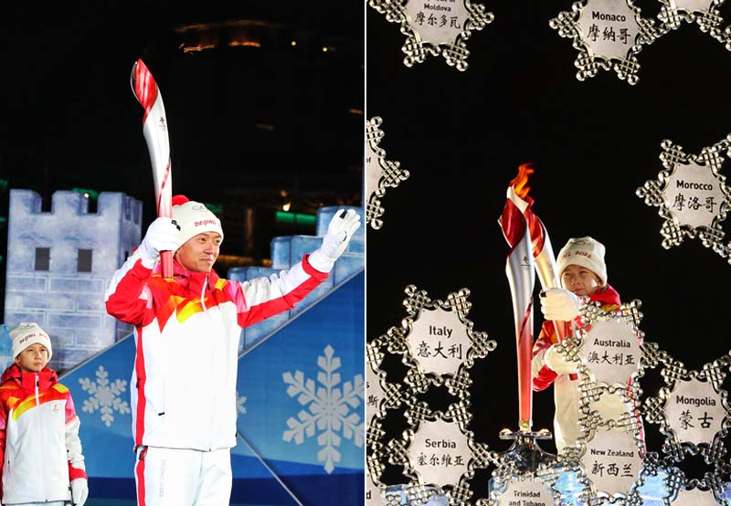 当天晚上10时31分,在火种护卫队的护送下,奥运之火来到广场南侧。在近200名延庆各界群众代表的见证下,世界短道速滑冠军俞勇俊点燃手中的火炬,随后他高举火炬,向四周展示,将手中火炬交给延庆区“冰雪运动好少年”王瀚一,寓意冬奥精神和奥运精神的薪火相传。王瀚一手持火炬,沿着长城意向的阶梯,伴随着激昂的音乐登上平台点燃火炬。