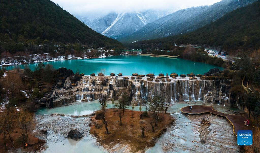 Aerial photo taken on Jan. 13, 2022 shows the winter scenery of Lanyue (Blue Moon) Valley in Lijiang, southwest China's Yunnan Province. [Photo by Wang Guansen/Xinhua]
