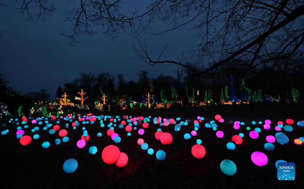 Illuminated sculptures are on display during a light festival at Thoiry zoo near Paris, France, Feb. 13, 2022. The festival runs till March 6, 2022. (Xinhua/Gao Jing)