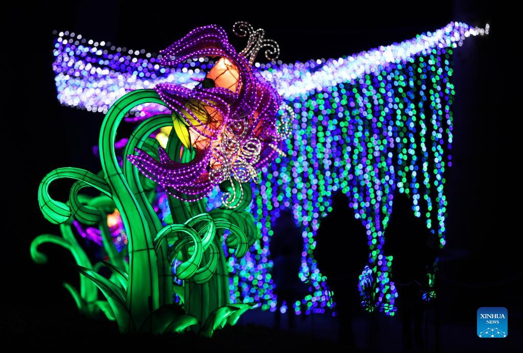 Illuminated sculptures are on display during a light festival at Thoiry zoo near Paris, France, Feb. 13, 2022. The festival runs till March 6, 2022. (Xinhua/Gao Jing)