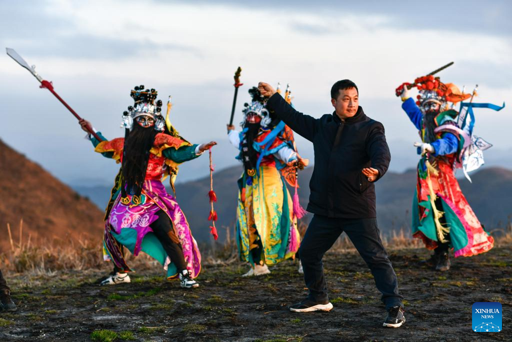 Members of a local opera troupe rehearse in Longshan Township, southwest China's Guizhou Province, Feb. 7, 2022. Deep in the mountains in Longli County, Qiannan Buyi and Miao Autonomous Prefecture, there is a grass-roots troupe performing Taiping Huadengxi, or Taiping lantern opera, in Longli. Taiping Huadengxi which combines singing and dancing is a traditional local opera in Guizhou and was enlisted as a provincial intangible cultural heritage in 2019. Most troupe members are ordinary farmers, who gather together after their farm work to rehearse and exchange experiences. The ages of its members range from 8 to 87 years old. On holidays, they visit nearby villages to perform for villagers, enriching their cultural lives. (Xinhua/Yang Wenbin)