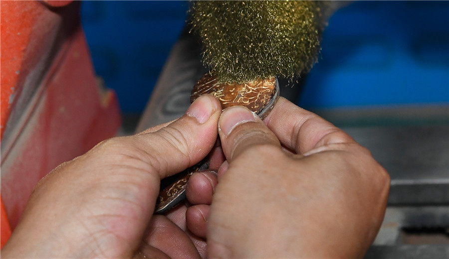 Zhang Bidi polishes coconut carvings in Qionghai city, south China's Hainan province, on Feb 18, 2022. [Photo/Xinhua]