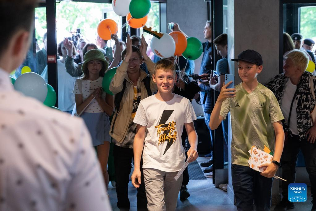 Customers enter the newly opened fast food restaurant in a former McDonald's outlet in central Moscow, Russia, on June 12, 2022. The successor to McDonald's in Russia, "Vkusno - i tochka," reopened the first batch of 15 restaurants in Moscow and its suburbs on Sunday, three months after the U.S. fast-food chain ended its business in Russia. [Photo by Bai Xueqi/Xinhua]