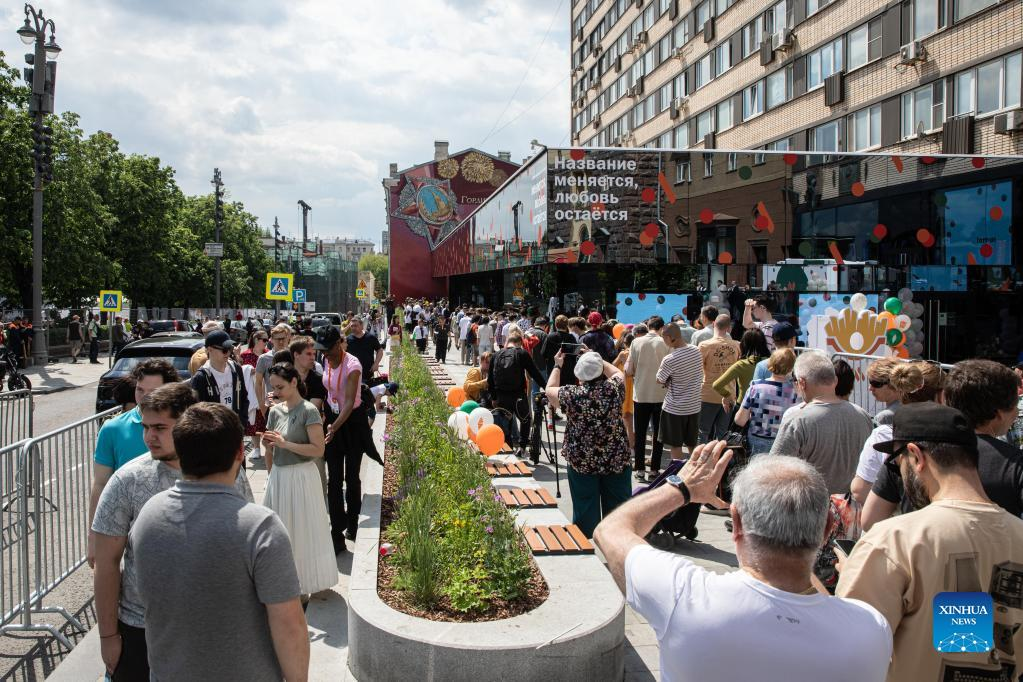 People line up to enter the newly opened fast food restaurant in a former McDonald's outlet in central Moscow, Russia, on June 12, 2022. The successor to McDonald's in Russia, "Vkusno - i tochka," reopened the first batch of 15 restaurants in Moscow and its suburbs on Sunday, three months after the U.S. fast-food chain ended its business in Russia. [Photo by Bai Xueqi/Xinhua]