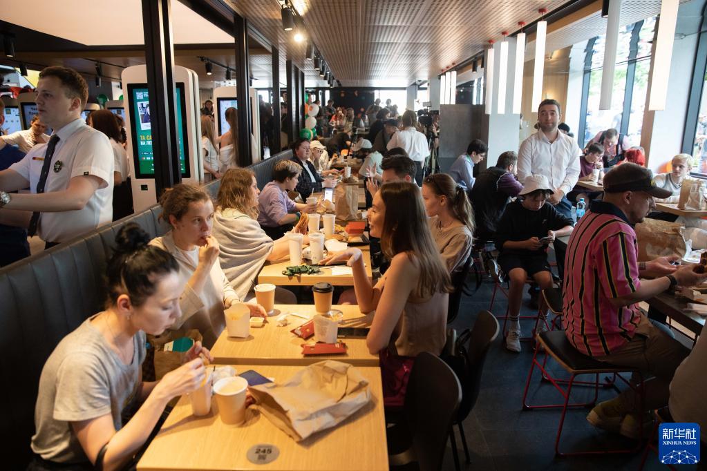 6月12日,顾客在俄罗斯首都莫斯科普希金广场的“只有美味”连锁餐厅用餐。位于莫斯科市中心普希金广场的原麦当劳餐厅12日重新开业,正式更名为“只有美味”。这里曾经是麦当劳30多年前进入俄罗斯市场后开设的首家门店。当天重新开业的共有莫斯科和莫斯科州的15家原麦当劳餐厅。3月14日,麦当劳宣布暂停在俄业务,称原因是出现“运营、技术和物流困难”。5月16日,这家在俄罗斯餐饮市场占据7%份额的美国快餐连锁巨头宣布退出俄罗斯。[新华社记者 白雪骐 摄]