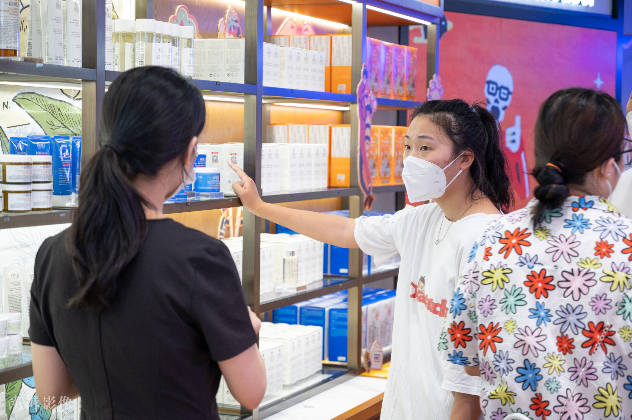 2022年9月21日,海南三亚,三亚海棠湾国际免税城恢复营业首日,顾客在现场购买商品。据悉,国际免税城在长达一月的沉寂后,终于迎来了第一次营业,大量的顾客纷纷有序的进入免税店挑选自己心仪的免税物品。[澎湃影像/IC Photo]
