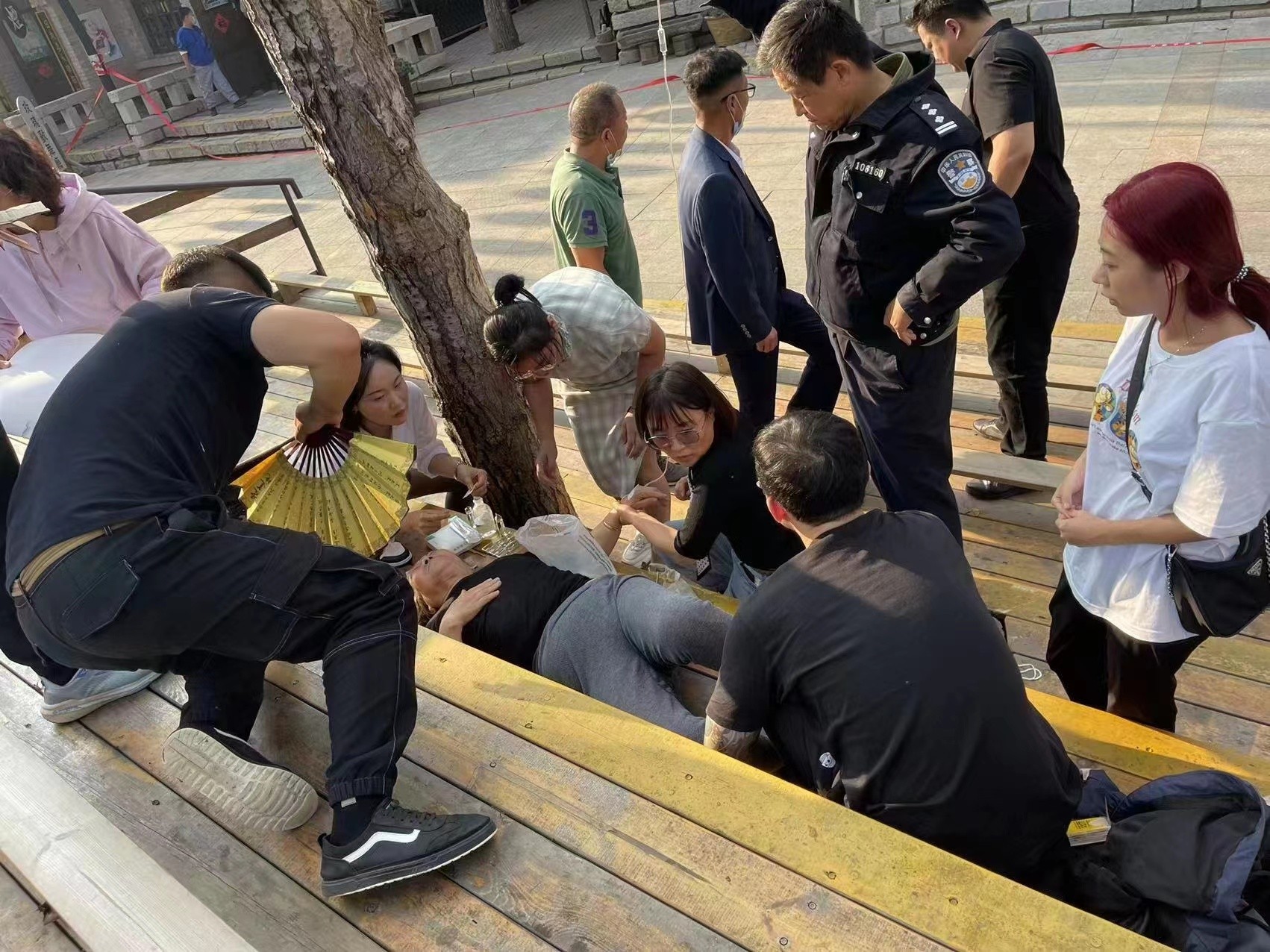 崔扬二话没说,一路小跑来到了施救现场。此时,一名穿着旗袍的女子正在为地上躺着的老人实施心肺复苏。