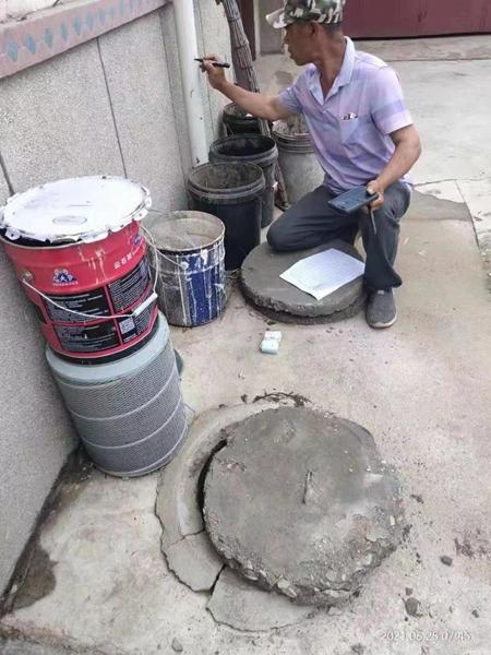 工人在一家改厕现场测量 [王台北村村委 供图]