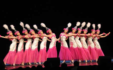 Actresses perform a Kazak ethnic dance during a performance at the Lincoln Center in New York, the United States, Jan. 31, 2009. Two performances presented by a troupe led by Li Haifeng, director of the Overseas Chinese Affairs Office of the State Council of China, were held to celebrate the traditional Chinese Lunar New Year. [Xinhua]