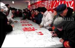 Citizens sign on a scroll in a campaign against the Falun Gong Cult and advocating the human rights in Beijing on Jan.31. This public campaign was staged in the wake of disclosure of suicidal attempts of 7 Falun Gong practitioners by burning themselves at Tiananmen Squae on Jan.23.