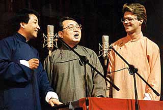Jiang Kun (left), today's most prominent xiangsheng performer, takes Dashan (right) as an apprentice in 1989, making him the first foreigner to ever be accepted into the formal xiangsheng hierarchy. [dashan.com.cn]