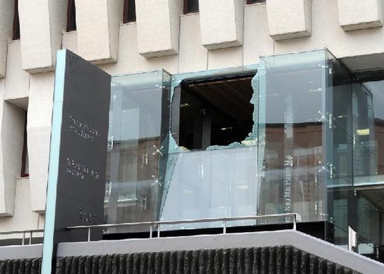 Photo taken on July 22, 2013 shows a shattered window at the National Library Building on Molesworth Street in Wellington after a 6.5 magnitude earthquake shook New Zealand's capital Wellington and upper South Island on Sunday afternoon. [Photo/Xinhua] |