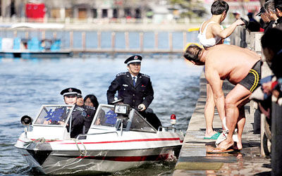 Urban management officials persuade several residents not to swim in the Shichahai Lake. [File photo] |