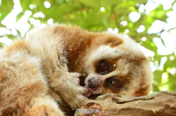An adorable big-eyed slow loris enjoys honey at a park in Pu'er City, southwest China's Yunnan Province on April 3. The slow loris, one of the first-grade nationally protected animals in China, is threatened by wildlife trade and habitat loss. [Photo/Weibo.com] |