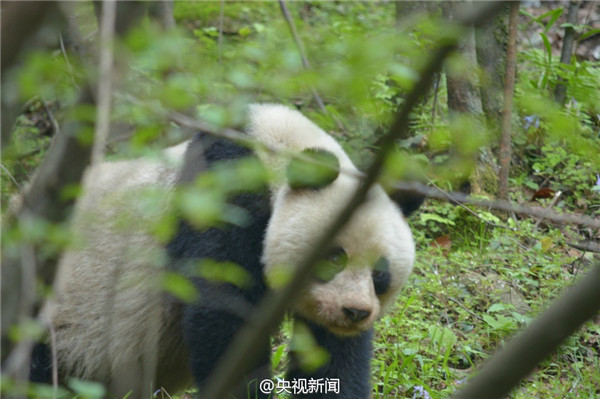 A wild giant panda is spotted in a bamboo forest in southwest China's Sichuan Province. [Photo/Sina Weibo account of CCTV]