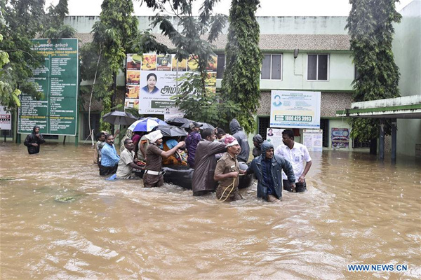 Rescuers evacuate people to safe places in Chennai, India, Dec. 1, 2015. Many parts of Chennai and its suburbs were flooded after two days of heavy rainfall. [Photo/Xinhua] |