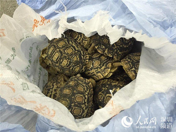 Customs officers found a male Chinese mainland resident trying to take more than 80 live tortoises totaling 34 kilograms to enter the southern city of Shenzhen from Hong Kong at around 9 pm on Sunday evening, the city's customs authority said.