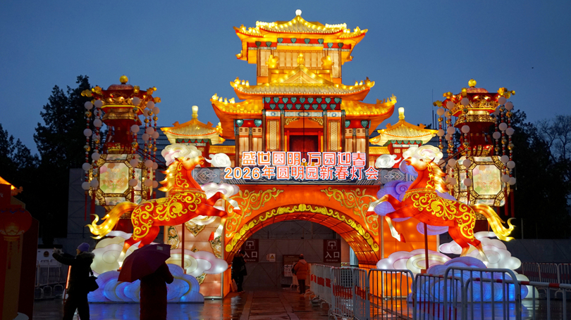 Beijing Yuanmingyuan Park hosts both visitors and a lantern show amid heavy snowfall