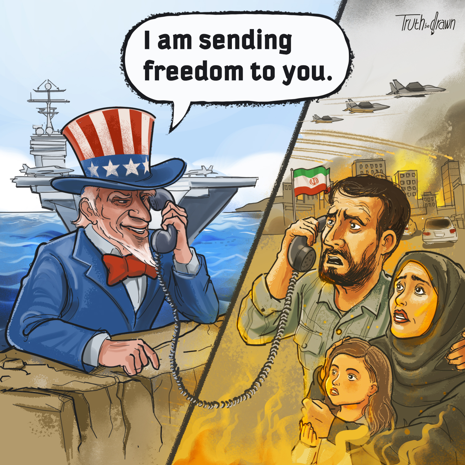 Under the pretext of "democracy" and "freedom," a U.S. armada is shrouding the Middle East in the clouds of war. As a sovereign state, Iran has the right to decide its own affairs, and no outside forces have the right to do so.