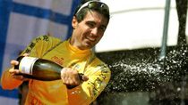Italy's Francisco Ventoso sprays the champagne on the podium of the last stage of the 2009 Tour of Hainan International Road Cycling Race in Sanya, the southernmost city of south China's Hainan Province, Nov. 19, 2009. A total of 104 cyclists from 20 teams took part in this stage of the race.[Xinhua] |
