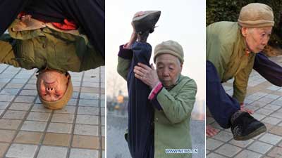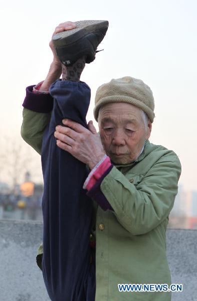 Eighty-two-year-old Zhao Yufang stretches her leg in the residential compound she lives in Beijing, capital of China, Dec. 4, 2010. Zhao created herself a unique body exercise combining Yoga, Wushu or martial arts, and Qigong or breathing exercise in her sixties, and three hours of daily practice over years has granted her with good fitness. [Xinhua/Liu Yu]
