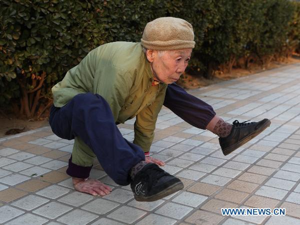 Eighty-two-year-old Zhao Yufang exercises in the residential compound she lives in Beijing, capital of China, Dec. 4, 2010. Zhao created herself a unique body exercise combining Yoga, Wushu or martial arts, and Qigong or breathing exercise in her sixties, and three hours of daily practice over years has granted her with good fitness. [Xinhua/Liu Yu]