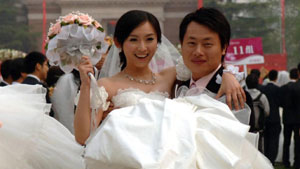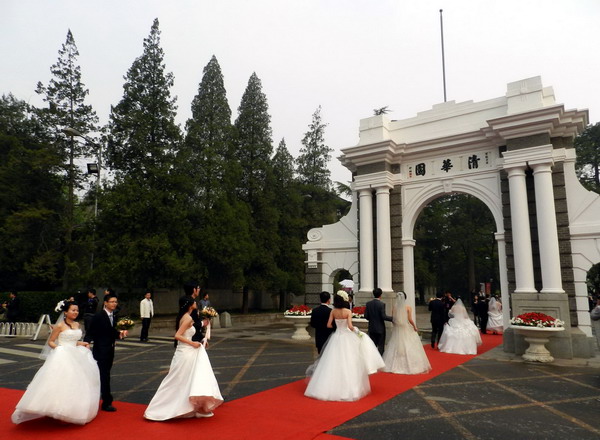 Newlywed couples go through the front gate of Tsinghua University in Beijing April 29, 2011. About 400 couples of Tsinghua University's staff members and alumnus will attend the two-day wedding ceremony from April 29 to April 30 at the university, following its 100th anniversary ceremony on April 24. [Photo: Xinhua] |