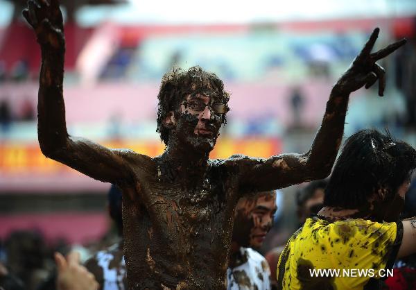 A foreign tourist poses during the "Monihei" carnival held in the Va Ethnic Autonomous Prefecture of Cangyuan, southwest China's Yunnan Province, May 2, 2011. The four-day carnival kicked off here Sunday, where people mudded each other with clay-like material to express their wishes for health and happiness. [Xinhua/Qin Qing]