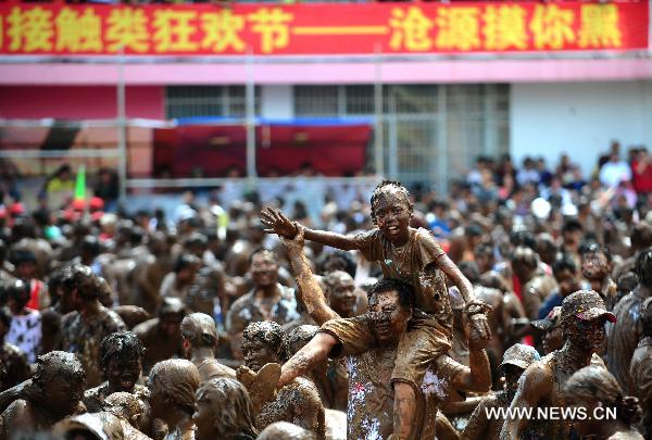 Tourists and local Va ethnic people take part in the "Monihei" carnival held in the Va Ethnic Autonomous Prefecture of Cangyuan, southwest China's Yunnan Province, May 2, 2011. The four-day carnival kicked off here Sunday, where people mudded each other with clay-like material to express their wishes for health and happiness. [Xinhua/Qin Qing]