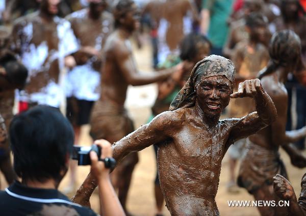 A man covered with mud poses during the "Monihei" carnival held in the Va Ethnic Autonomous Prefecture of Cangyuan, southwest China's Yunnan Province, May 2, 2011. The four-day carnival kicked off here Sunday, where people mudded each other with clay-like material to express their wishes for health and happiness. [Xinhua/Qin Qing]