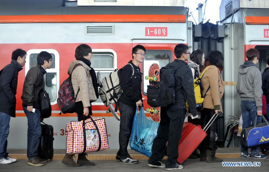 Passengers line for getting on the train at Yinchuan Railway Station in Yinchuan, capital of Ningxia Hui Autonomous Region, Feb. 16, 2012. A total of 3.16 billion passenger trips are expected during this year's 40-day Spring Festival holiday travel rush, which will end on Feb. 16. The Spring Festival holiday, also known as the beginning of the Chinese Lunar New Year, is the country's biggest and most important holiday. [Xinhua] |