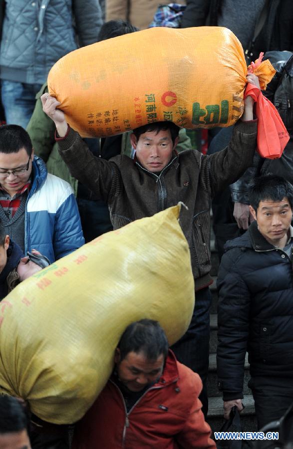 Passengers carrying luggage walk out of Nanjing Railway Station in Nanjing, capital of east China's Jiangsu Province, Feb. 16, 2012. A total of 3.16 billion passenger trips are expected during this year's 40-day Spring Festival holiday travel rush, which will end on Feb. 16. The Spring Festival holiday, also known as the beginning of the Chinese Lunar New Year, is the country's biggest and most important holiday. [Xinhua] |