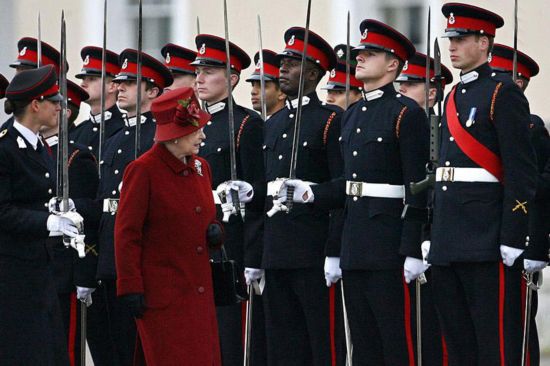 Dec. 18, 2006, Queen Elizabeth inspects graduation commencement of military academy. Prince William (R, 1st)