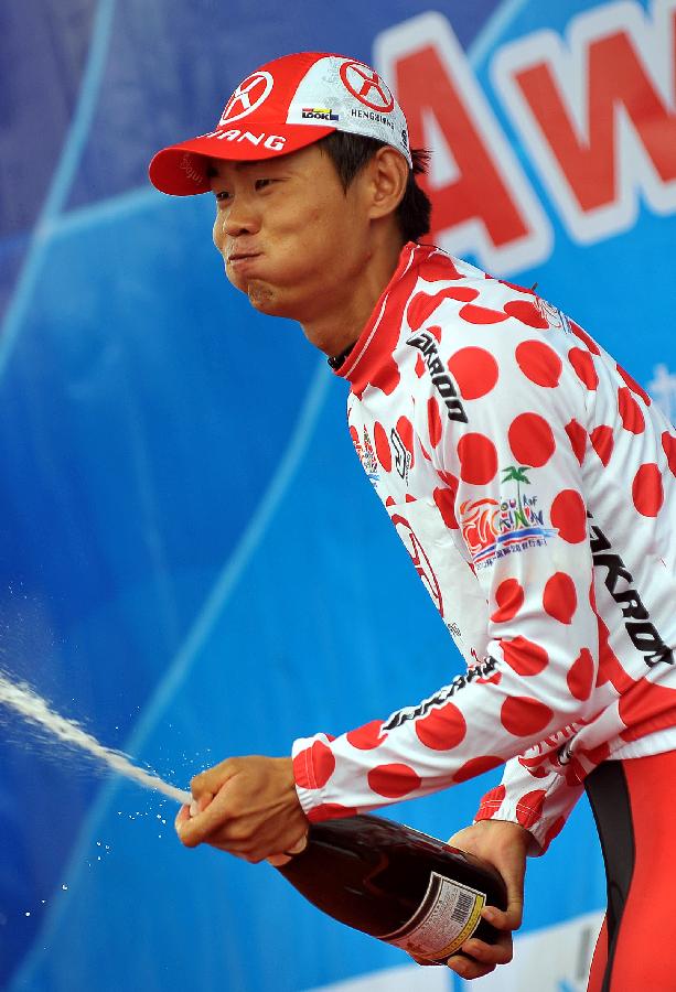 China's Wang Meiyin from Hengxiang Cycling Team, who kept the polka dot jersey, sprays champagne on the podium after the last stage of the 2012 Tour of Hainan International Road Cycling Race in Sanya, south China's Hainan Province, Oct. 28, 2012. Dmitriy Gruzdev of Astana claimed the title after the final stage with a time of 34 hours 12 minutes 33 seconds in general standing. |