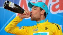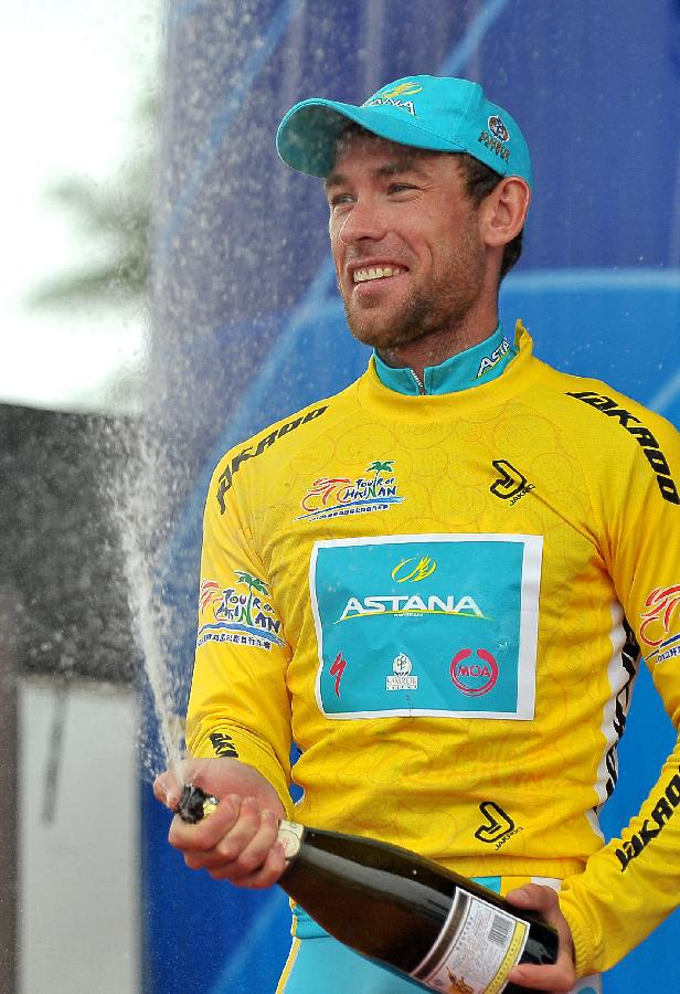 Kazakhstan's Dmitriy Gruzdev from Astana sprays champagne on the podium after the last stage of the 2012 Tour of Hainan International Road Cycling Race in Sanya, south China's Hainan Province, Oct. 28, 2012. Dmitriy Gruzdev of Astana claimed the title after the final stage with a time of 34 hours 12 minutes 33 seconds in general standing. |